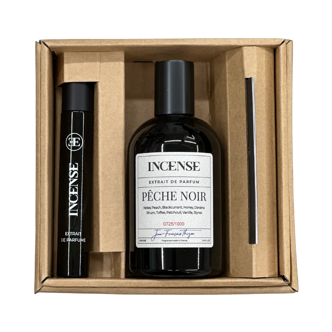 בושם יוקרתי INCENSE PECHE NOIR במהדורה מוגבלת מגיע במארז מעוצב ייחודי המכיל בקבוק בנפח 100 מ"ל בנפח 10 מ"ל. PECHE NOIR עוצב בהשראת מטעי האפרסקים היפניים המסורתיים ומציג קומפוזיציה מרהיבה הנפתחת עם תו עליון של אפרסק טרי ועסיסי. לב הבלנד מאופיין בחמימות ונילה מענגת, בעוד הבסיס חותם את היצירה עם עושר פולי טונקה ארומטיים. הניחוח מתפתח על העור ליצירת הרמוניה מושלמת בין מתיקות האפרסק לחמימות הווניל והטונקה. התוצאה היא חוויית ריח מסתורית ומתמשכת המשלבת רעננות ועומק, המתאימה לגברים ולנשים כאחד. המארז מהווה בחירה אידיאלית למי שמחפש בושם ייחודי ואיכותי, עם האפשרות ליהנות ממנו הן בבית והן בדרכים.