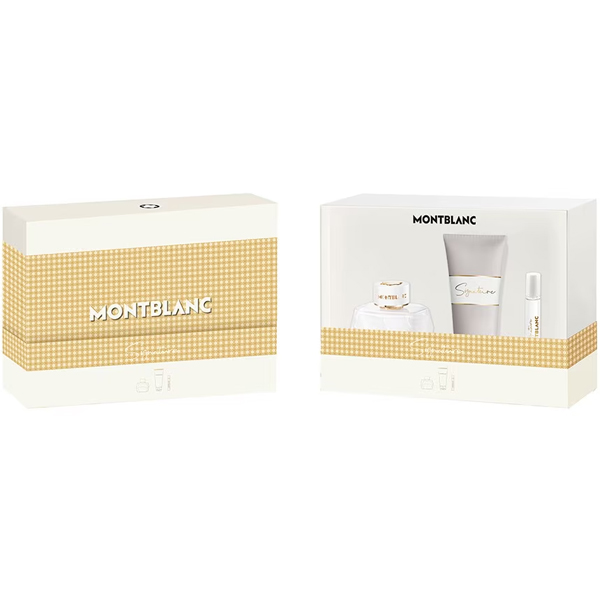 ‏MONTBLANC SIGNATURE SET FOR WOMEN כולל 3 מוצרים – בושם אדפ 90 מ״ל + בושם מוקטן 7.5 מ״ל + קרם גוף 100 מ״ל. הסט היוקרתי מאופיין בפרופיל ניחוח שובה לב עם תווים של יסמין, ורד ופריחת תפוז, היוצרים סנט נשי ומפתה. קרם הגוף התואם משלים את הבושם, מספק לחות תוך השארת ניחוח עדין על העור. הסט ארוז באלגנטיות, אידיאלי כאפשרות מתנה באירועים מיוחדים.